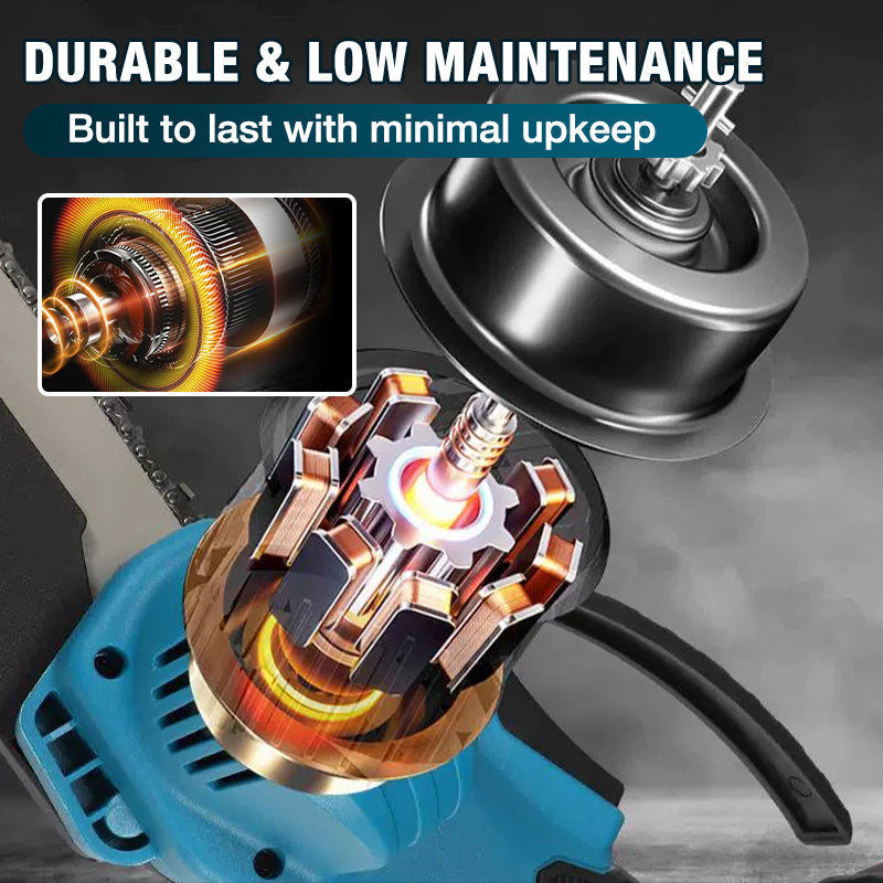 DURABILITÉ ET ENTRETIEN MINIMAL – Avec ses guides en acier au tungstène trempé et son moteur sans balais, cette tronçonneuse résiste à l'usure et dure 8-12 ans sans remplacement de balais, réduisant le temps de maintenance.
