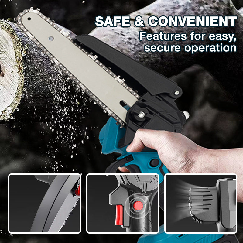 SÉCURITÉ ET PRATIQUE – Équipements inclus : pare-chocs élargi anti-recul, lubrification automatique de la chaîne, arrêt d'urgence, faible bruit, vibrations minimales et batterie amovible pour une utilisation simplifiée.