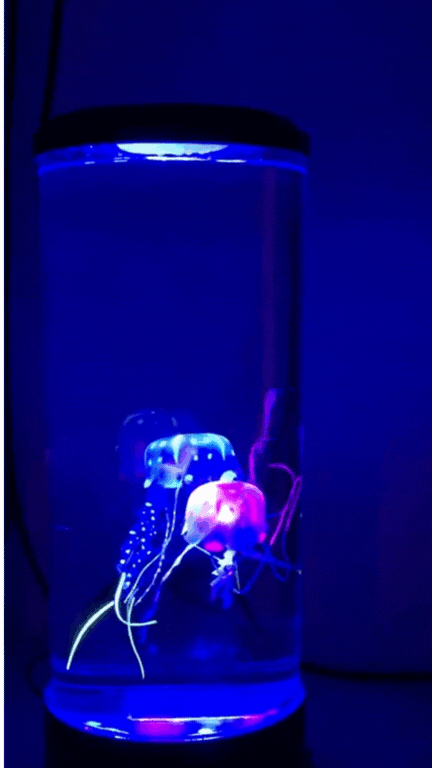 Il suffit de remplir l'aquarium avec de l'eau du robinet ordinaire, d'ajouter une ou deux gouttes de liquide vaisselle, et de laisser tomber les méduses. Ensuite, allumez, détendez-vous et profitez du spectacle.