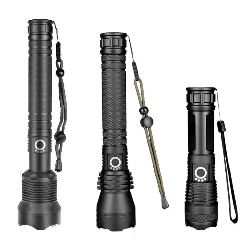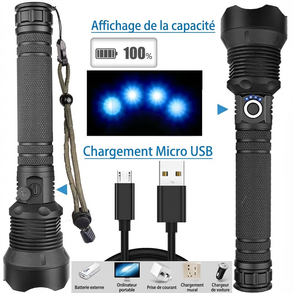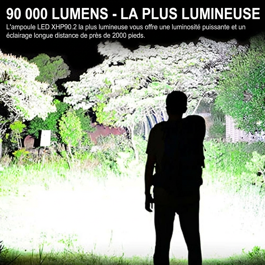 Lampe de poche LED P90 à haute luminosité, projecteur pour une longue portée et projecteur pour l'éclairage d'une grande zone. Cette lampe de poche tactique 90000Lumen est idéale pour les urgences, le camping, les inspections, les lampes de poche pour la police, et l'utilisation quotidienne.