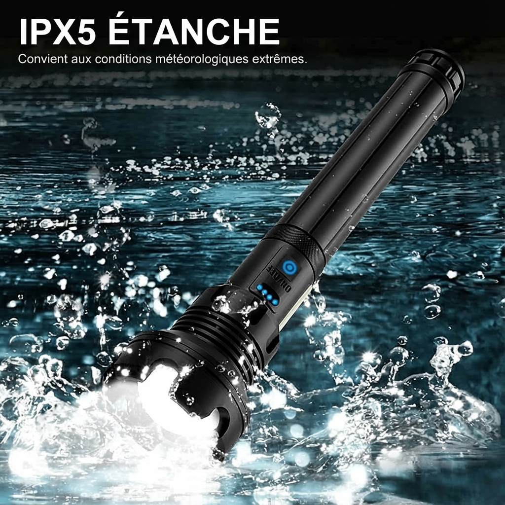 Illumination étonnante : Avec 90000 Lumens, la lampe de poche LED professionnelle est forte et robuste.
