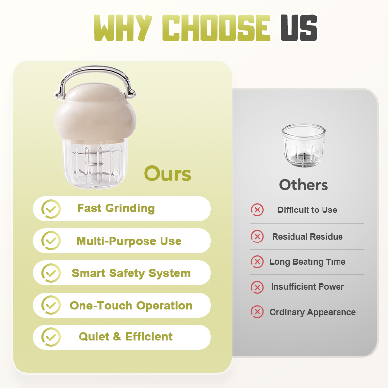 6 LAMES & MOTEUR PUISSANT – Conçues pour une efficacité sans effort, nos lames en acier inoxydable haute vitesse offrent un broyage de qualité restaurant en seulement 30 secondes. Idéal pour la viande, l’ail, les aliments pour bébé et la préparation des repas — vous faisant gagner du temps et de l'énergie en cuisine.