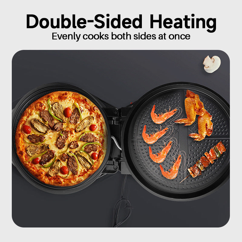 CHAUFFAGE DES DEUX CÔTÉS – Répartition uniforme de la chaleur. Le système de chauffage intégré des deux côtés garantit une cuisson homogène des aliments sur les deux faces, sans avoir besoin de les retourner. Cela améliore non seulement la saveur et la texture, mais accélère également le temps de cuisson, rendant la préparation des repas plus rapide et plus efficace.