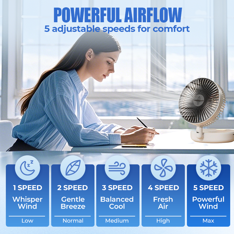 FLUX D’AIR PUISSANT – Profitez d’un rafraîchissement instantané grâce aux 5 vitesses réglables. Que vous souhaitiez une brise légère ou un souffle plus fort, ce ventilateur s’adapte facilement à vos préférences pour un confort optimal dans tous les environnements.