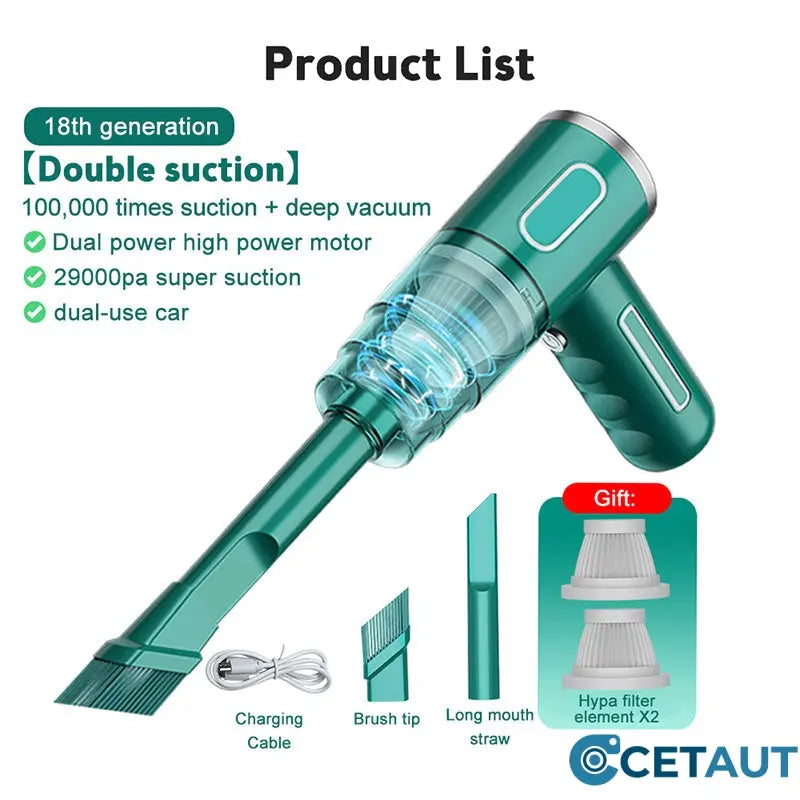 Gardez votre voiture impeccablement propre avec notre aspirateur de voiture sans fil. Il offre une double puissance d'aspiration, une batterie grande capacité pour une longue durée d'utilisation et un design compact et léger pour une manipulation facile.