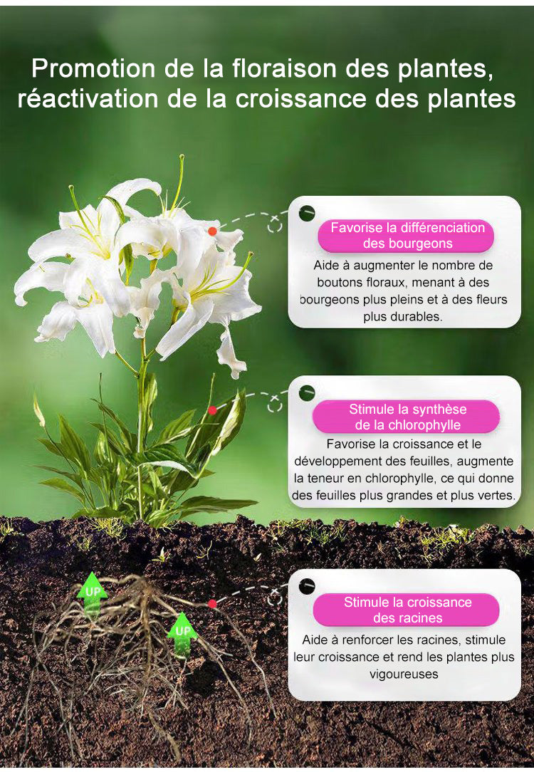 Les racines absorbent les auxines pour croître rapidement. Notre solution nutritive peut transformer les boutures en plantes à fleurs vigoureuses et saines. La solution nutritive contient un mélange de tous les micronutriments et minéraux essentiels dont de nombreuses variétés de fruits, de légumes et de plantes ont besoin, et qui ne figurent peut-être pas dans votre programme actuel de nutrition. Que vous souhaitiez faire pousser des légumes plus gros, un gazon plus sain, des fleurs plus grandes et plus vivantes, et bien plus encore, cette solution vous donnera les résultats dont vous rêvez.