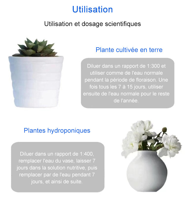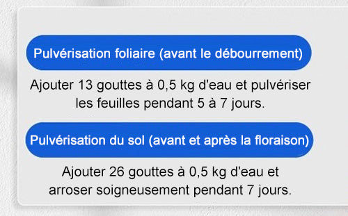Application : Pulvériser directement sur les feuilles ou les racines des plantes jusqu'à ce qu'elles soient légèrement humides.