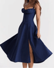 Vous vous sentirez ultra-féminine dans notre robe 'Carmen', qui est la combinaison parfaite pour les garden-parties printanières et estivales. Elle est confectionnée en coton stretch dans une belle nuance de bleu à motif et possède un corsage corseté pour une coupe cintrée avec un magnifique dos en dentelle. Le buste froncé a un cordon de serrage et la fente latérale ajoute un peu de sex-appeal pour révéler un éclair de jambe.