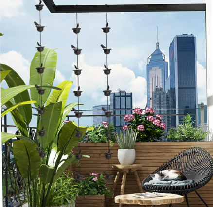 This cascading rain chain serves as a stunning alternative to traditional downspouts. Rainwater flows gracefully from one bird bath to the next, creating a natural waterfall effect that’s both visually and audibly calming.