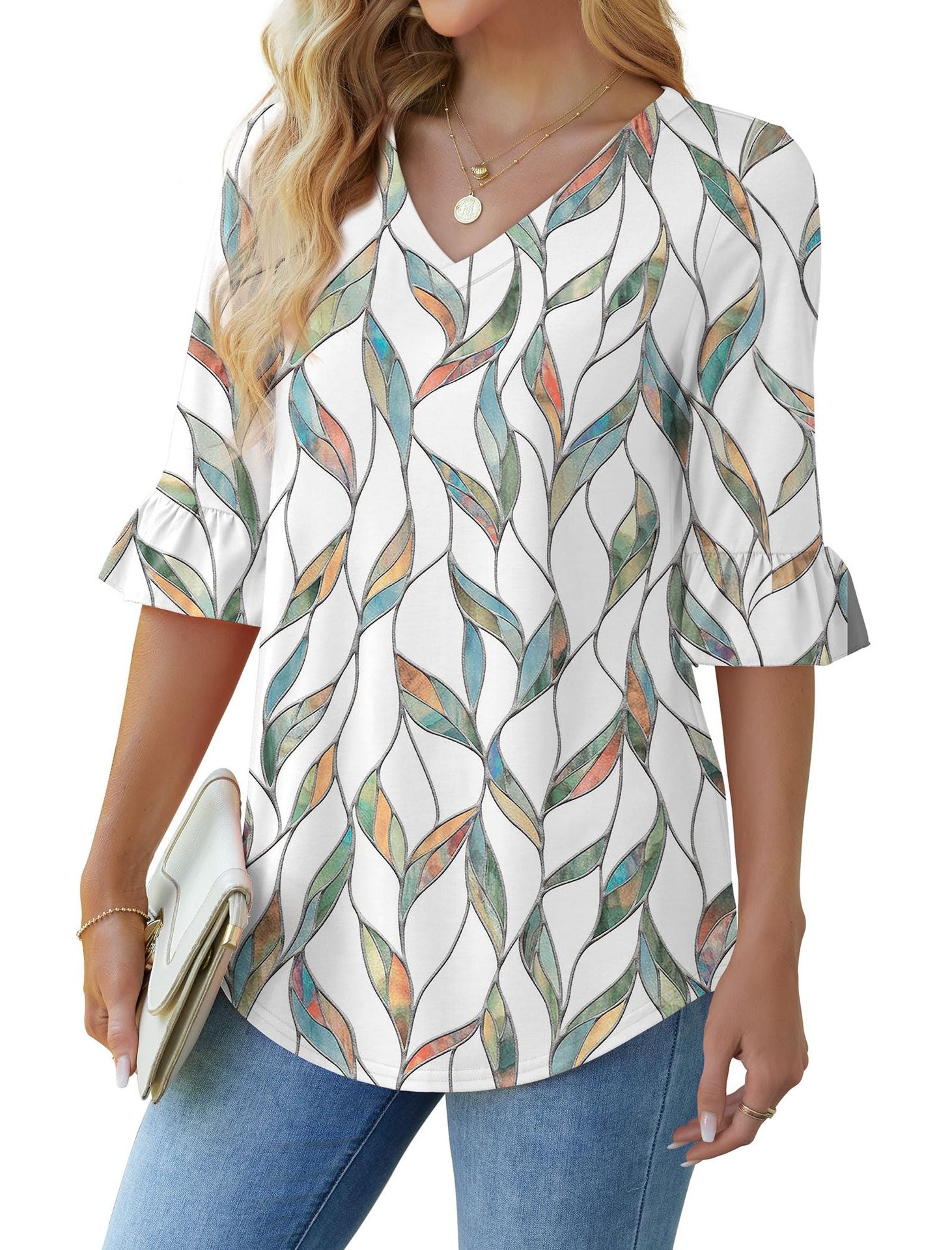 💕Limited Time Sale 50% Off👚Women's 3/4 Length Sleeve V-Neck Ruffle Sleeve Tunic Blouses