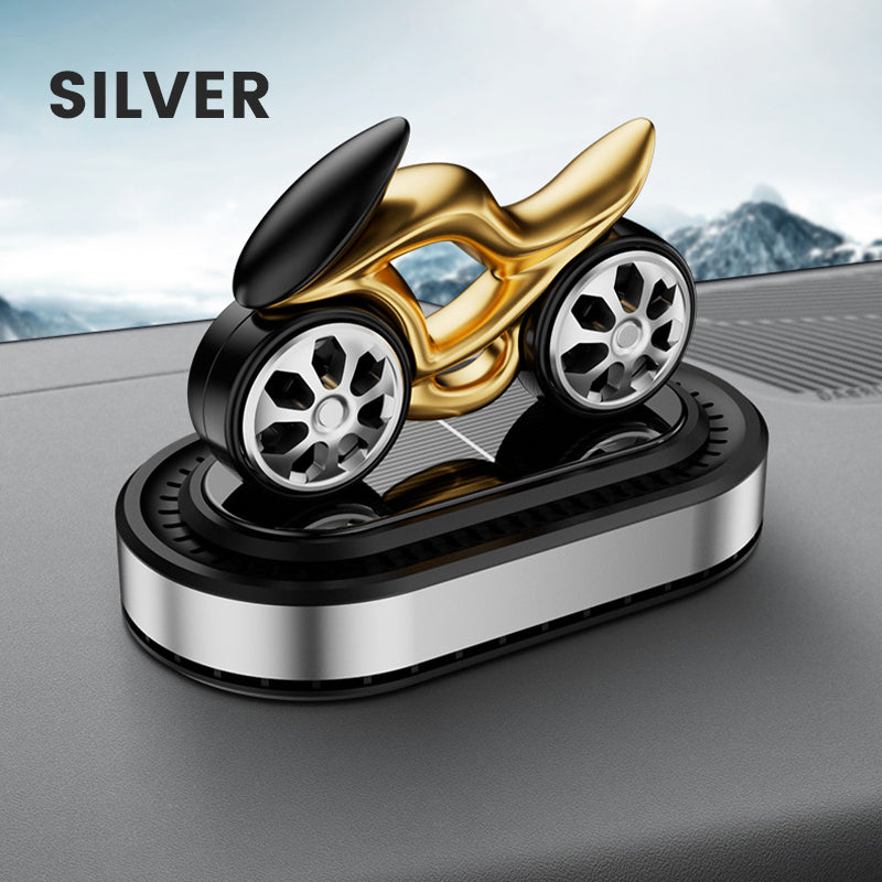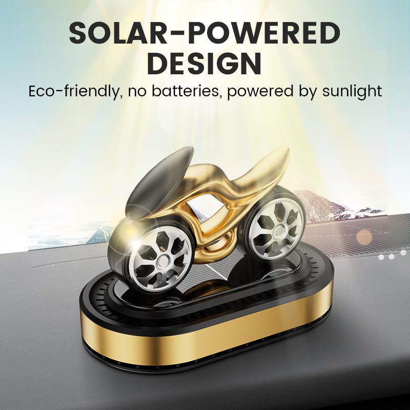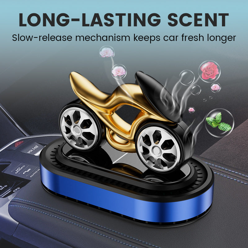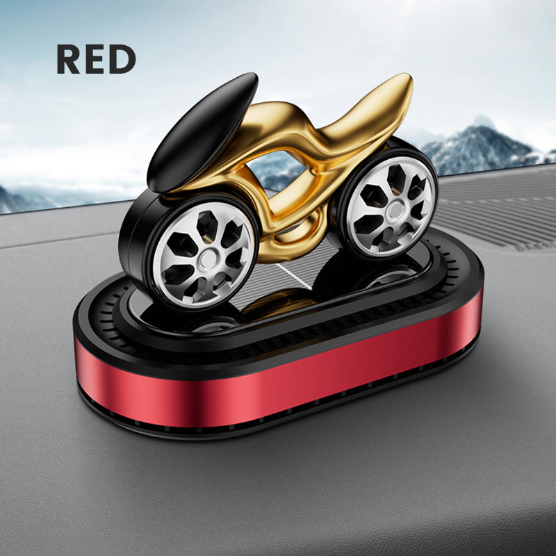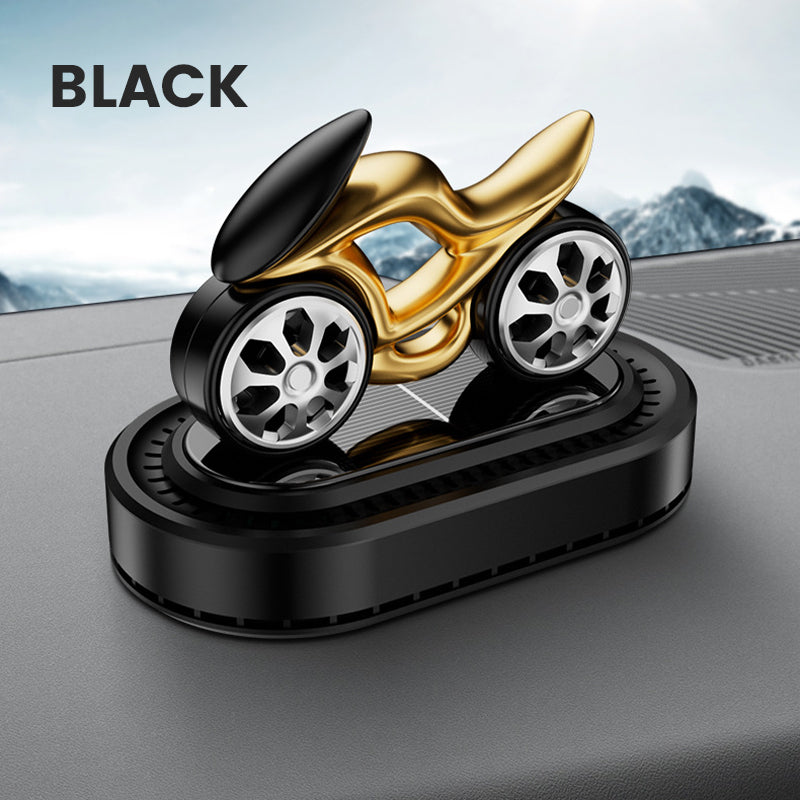 DESIGN EN FORME DE MOTO ALIMENTÉE PAR L’ÉNERGIE SOLAIRE – Ce diffuseur se distingue par sa forme unique de moto avec une roue tournante alimentée par énergie solaire. La rotation du pneu permet une diffusion uniforme du parfum, ajoutant charme et mouvement à votre voiture.