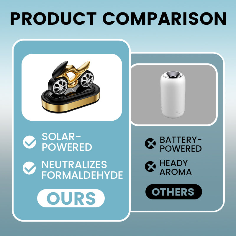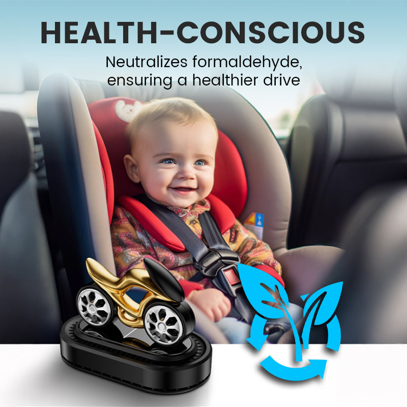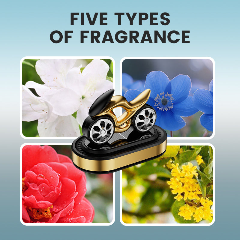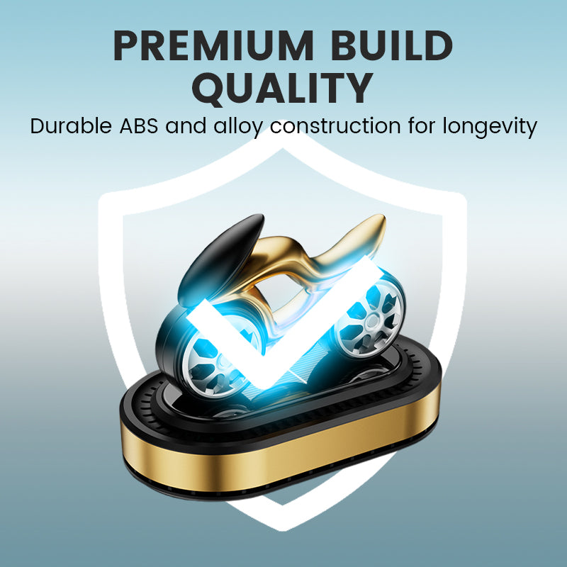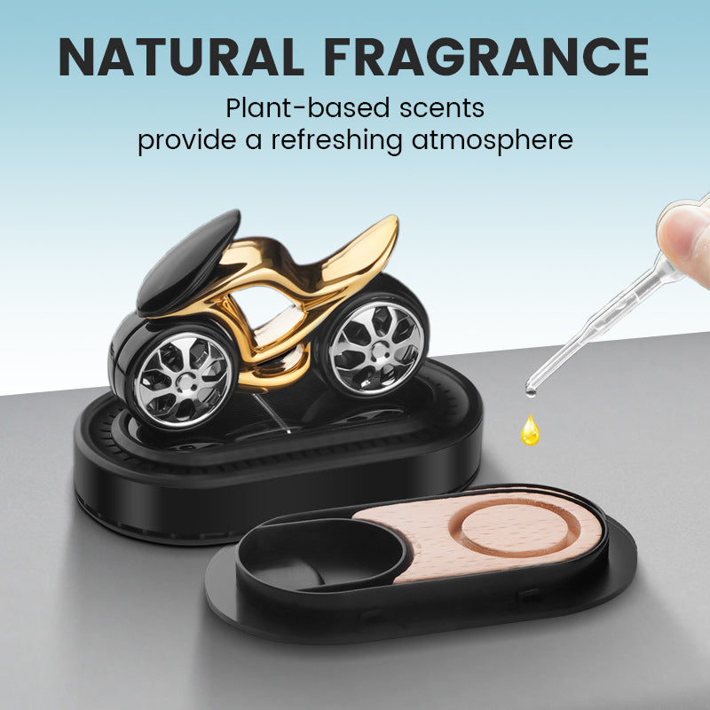 DESIGN EN FORME DE MOTO ALIMENTÉE PAR L’ÉNERGIE SOLAIRE – Ce diffuseur se distingue par sa forme unique de moto avec une roue tournante alimentée par énergie solaire. La rotation du pneu permet une diffusion uniforme du parfum, ajoutant charme et mouvement à votre voiture.