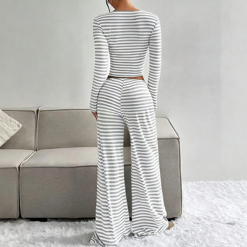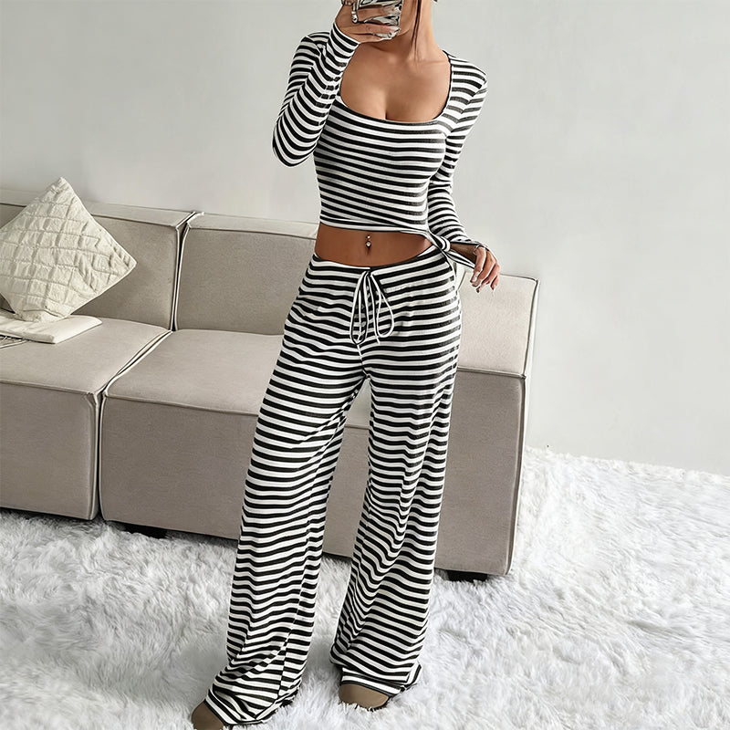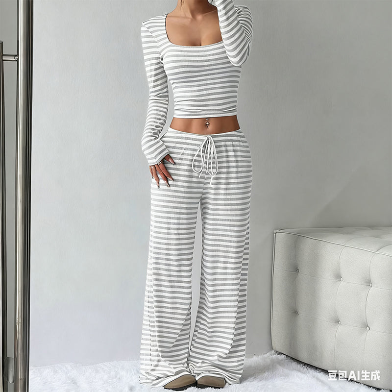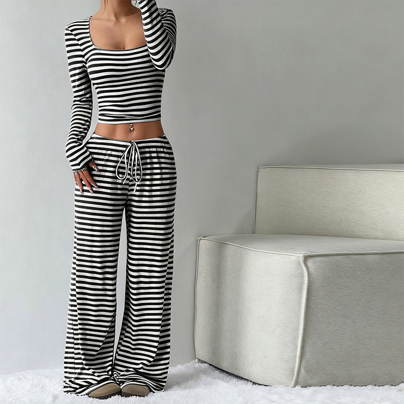 COUPE AMINCISSANTE : Le top en maille épouse délicatement le buste pour mettre en valeur les courbes naturelles, tandis que le pantalon large équilibre la silhouette en dissimulant les cuisses et en harmonisant la ligne des jambes. L’ensemble crée une allure élancée et allongée qui affine et met en valeur la taille.