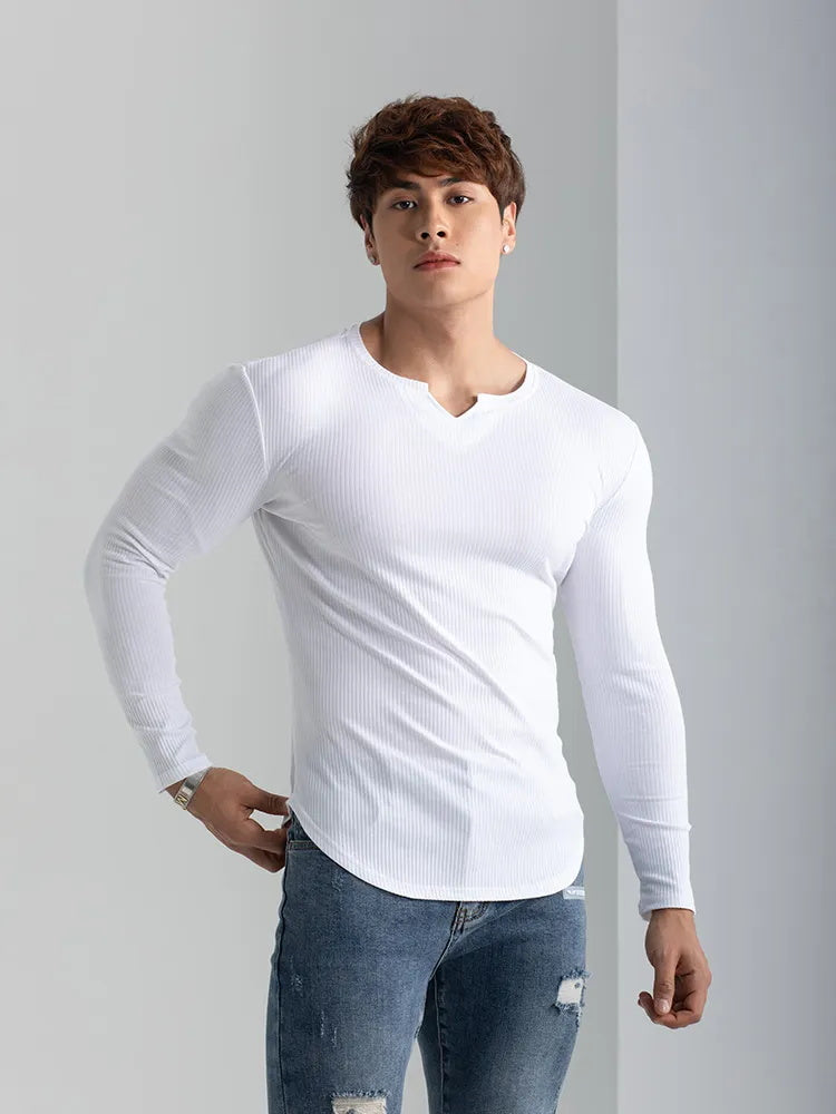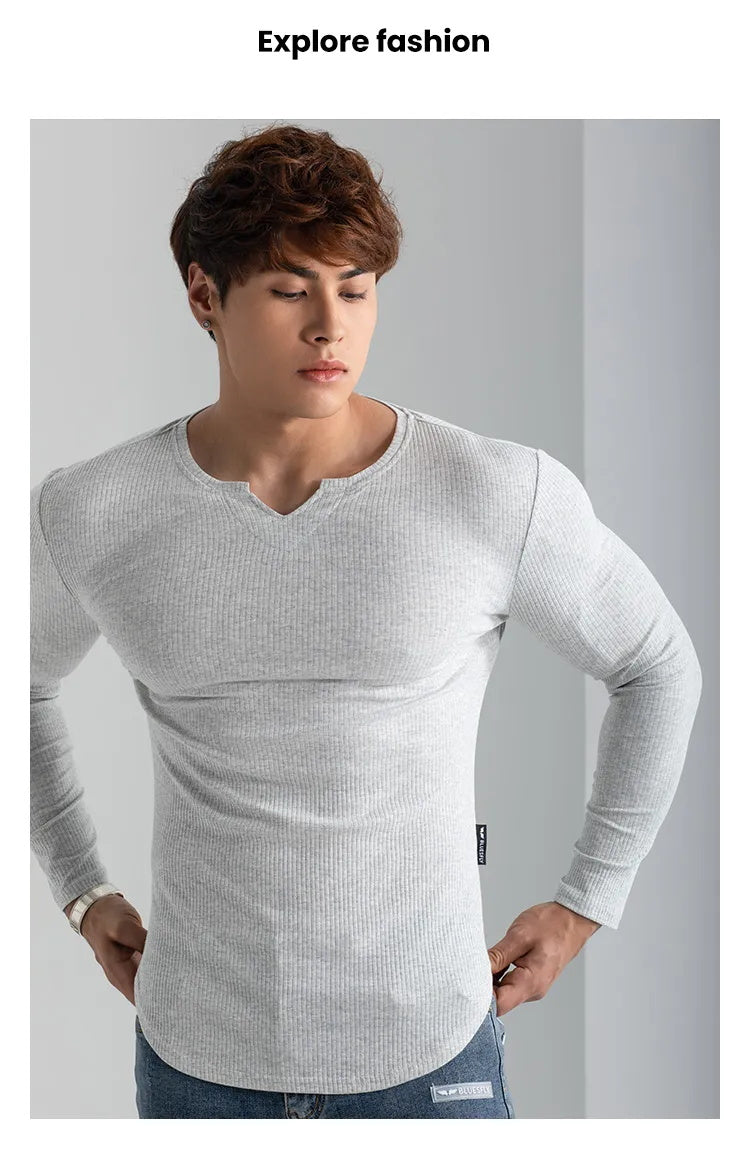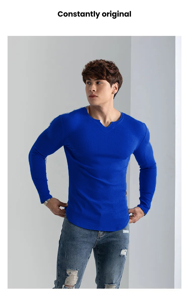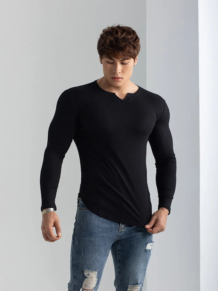 Rester au frais et à l'aise pendant toute séance d'entraînement avec notre T-shirt de sport à col en V et à manches longues. Fabriqué en matériaux de haute qualité et conçu avec une coupe athlétique, ce T-shirt est parfait pour tout sport ou activité.